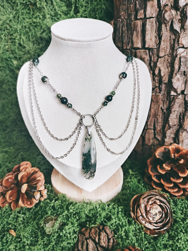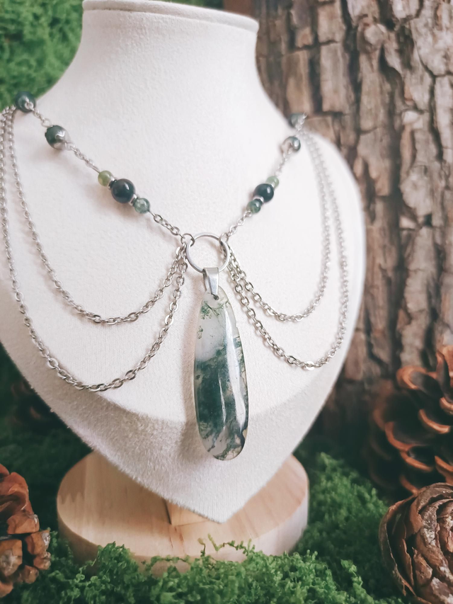 Ce collier porte en lui la résonance des bois profonds, là où chaque pierre chante l’écho d’un secret ancien. Le pendentif, semblable à une goutte figée de sève minérale, capture l’énergie vivante de la nature.