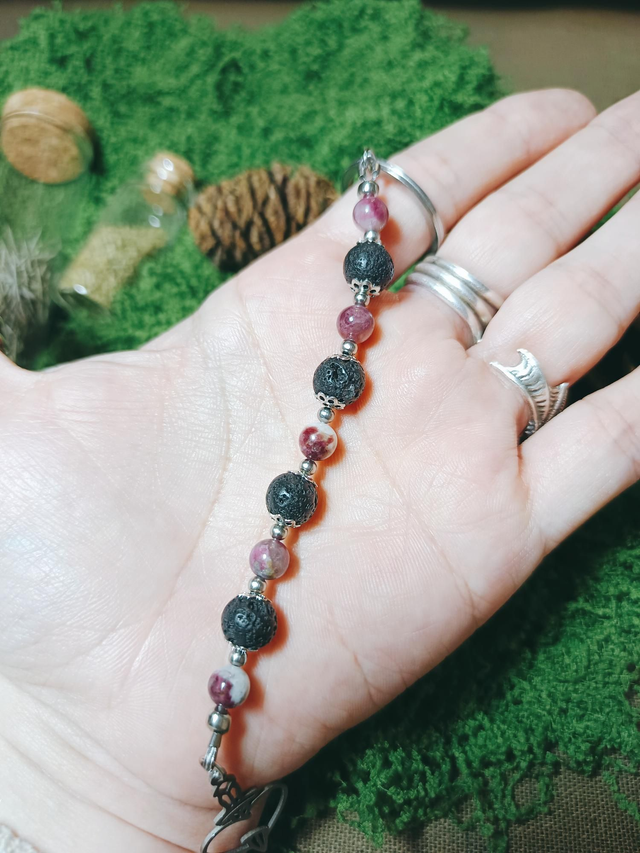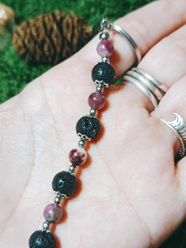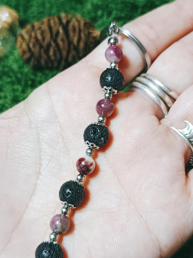 Pierre de transformation, de passion et d’ancrage, la rubellite stimule la force émotionnelle et la vérité intérieure, tandis que la pierre de lave ancre, protège et accompagne les renaissances personnelles.