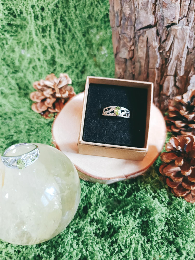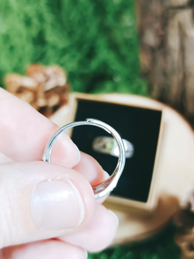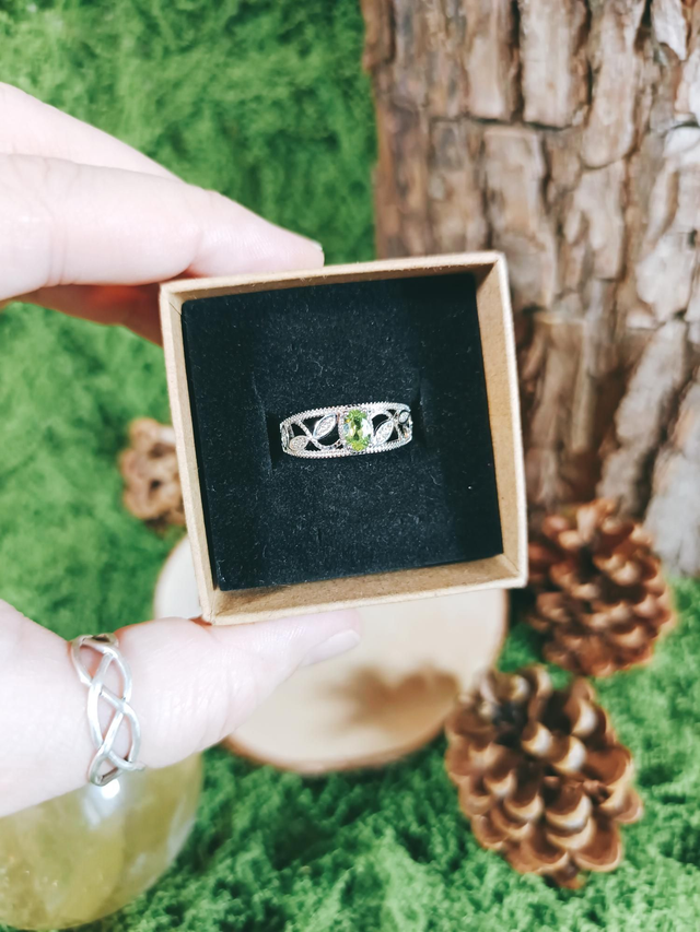 Cette bague en acier inoxydable est magnifique, avec sa pierre de péridot mais.. elle a un défaut d'émail (verdit le doigt), ce qui explique son tout petit prix.